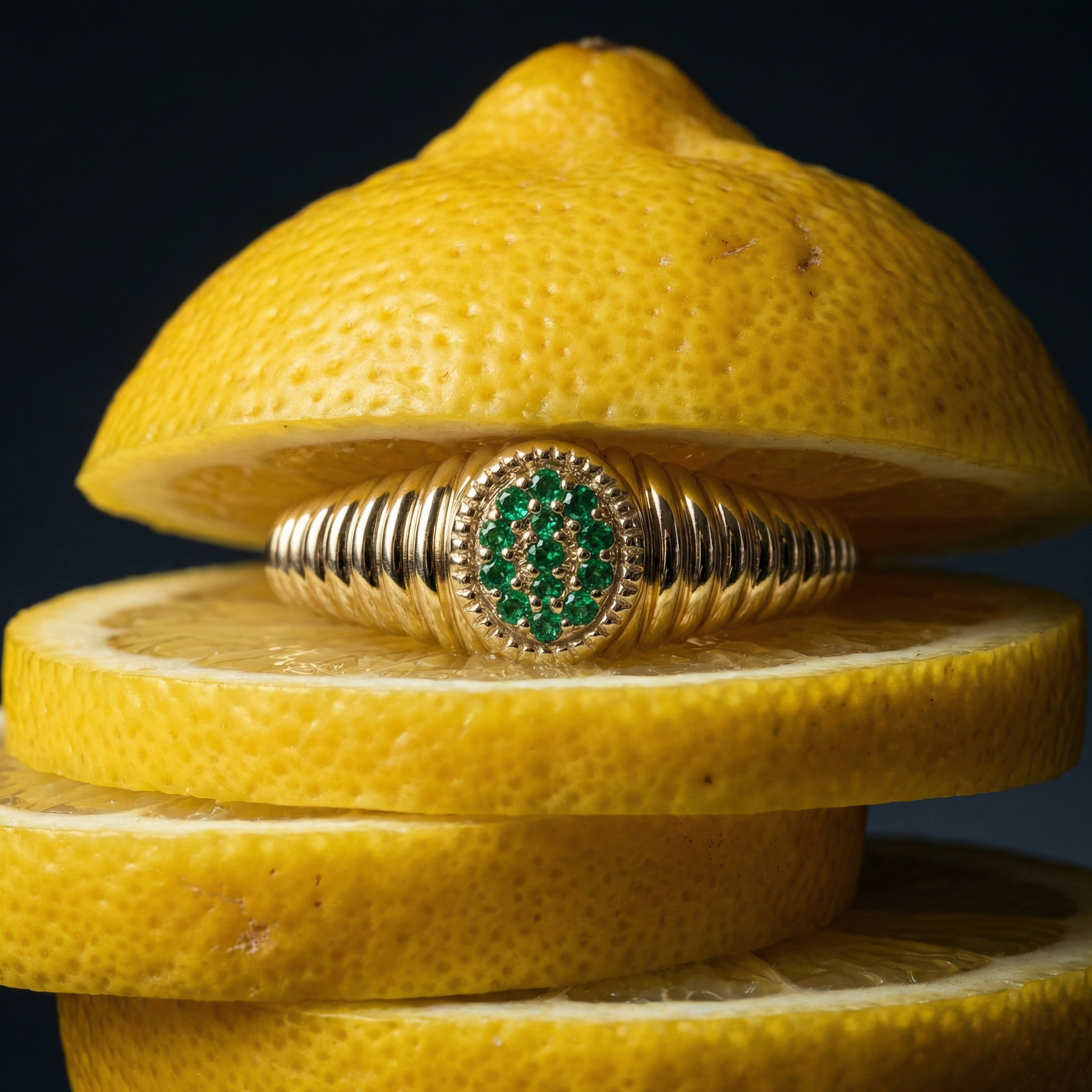Soft sparkle meets structured gold. Meet the Rachel Ring in green emeralds.